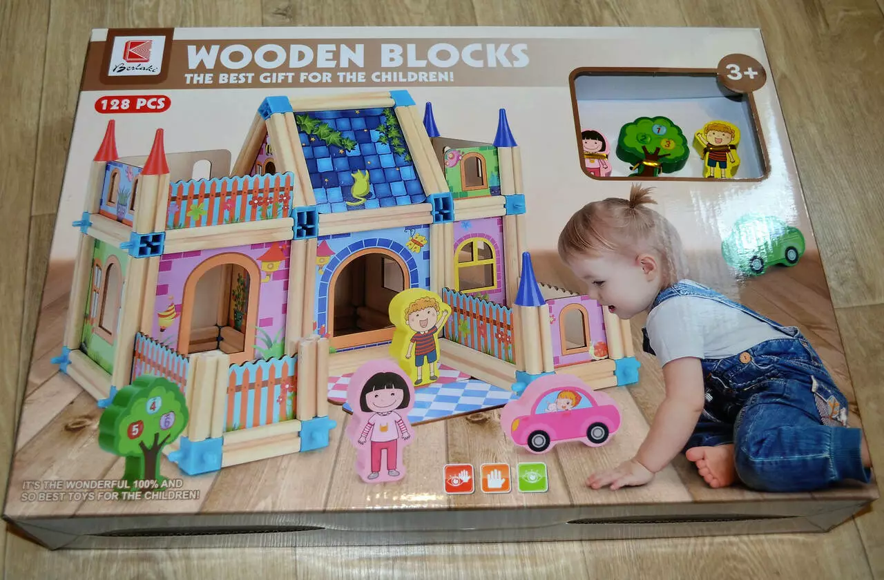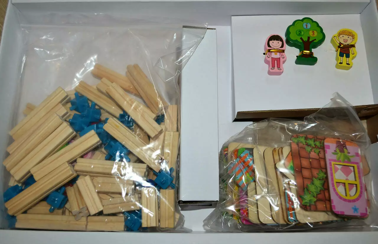 В наборе имеется 128 деревянных деталей, из которых нужно сложить довольно большой домик вместе с фигурками и прочими деталями для создания реалистичной картины.