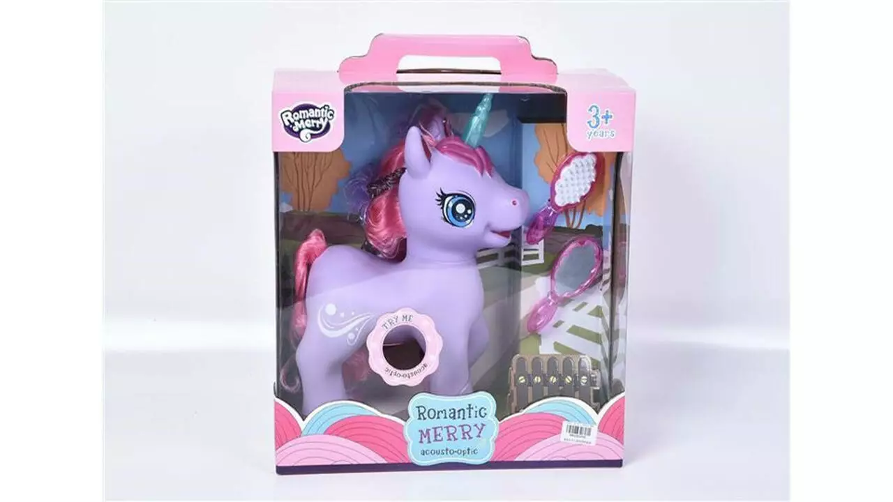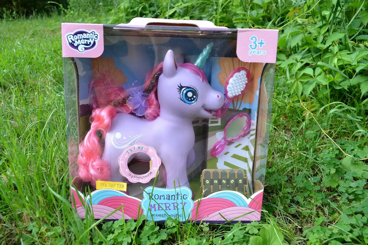 длинную гриву и хвост. У него также есть блестящий рог и копыта. Игрушка имеет световые и звуковые эффекты, играет музыка.