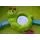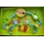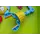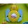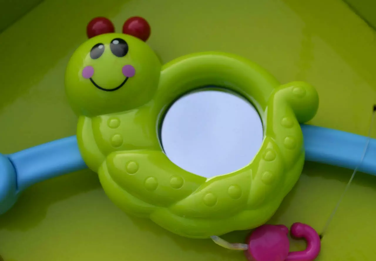 На пластиковой скобке расположены три объекта: лягушка и улитка с зеркалом, изготовленным из фольгированного картона, и подвесок к ним. Цветки с жучками-трещалками. При оттягивании подвеса цветок крутится.