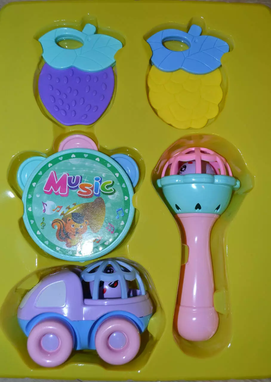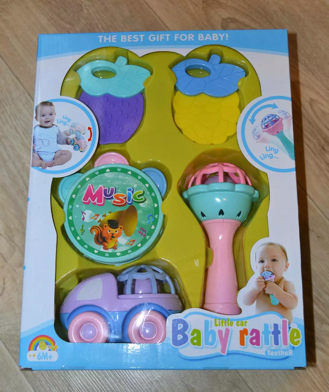 Набор погремушек для малышей Baby Rattle - это набор из 5 красочных и развивающих погремушек, которые идеально подходят для самых маленьких. Погремушки изготовлены из мягких и нетоксичных материалов, безопасных для детей. У них яркие цвета и привлекательные формы, которые обязательно заинтересуют вашего ребенка.
