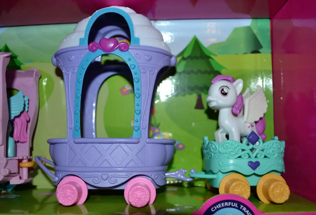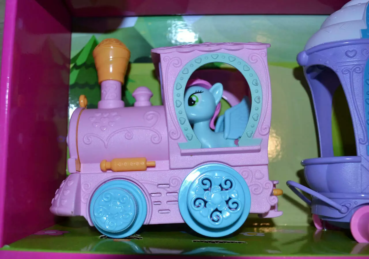 Игровой набор включает в себя паровоз, вагон и фигурку пони.