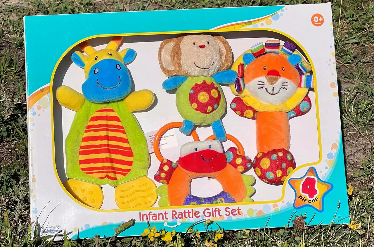 Погремушки издают разные звуки: звенят, скрежещут, скрипят. Имеют удобный размер даже для самых маленьких.